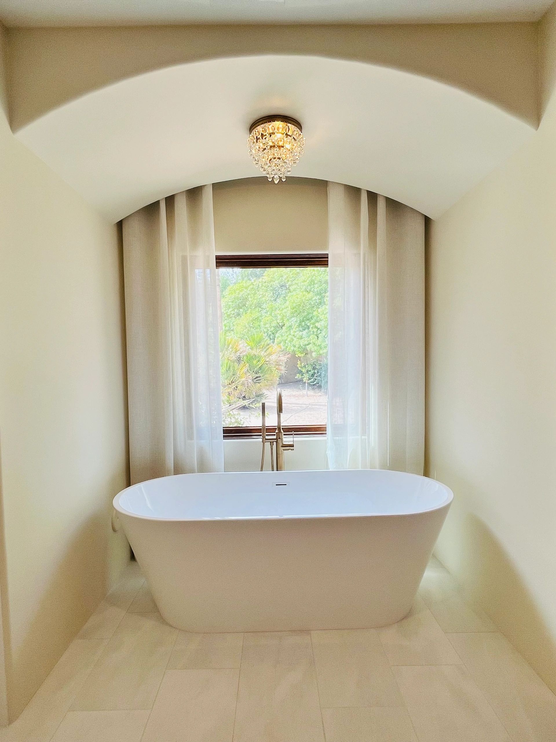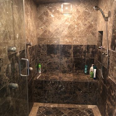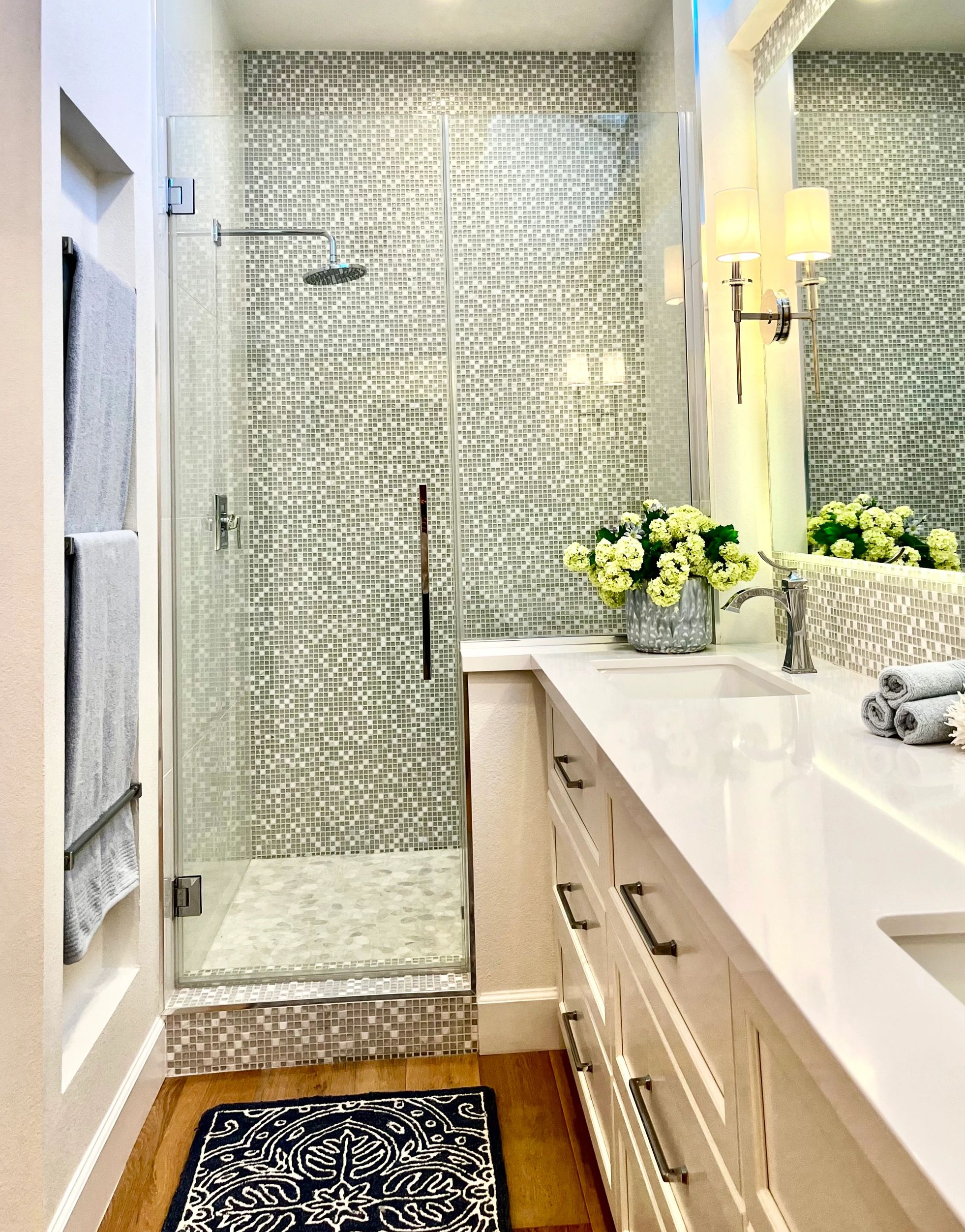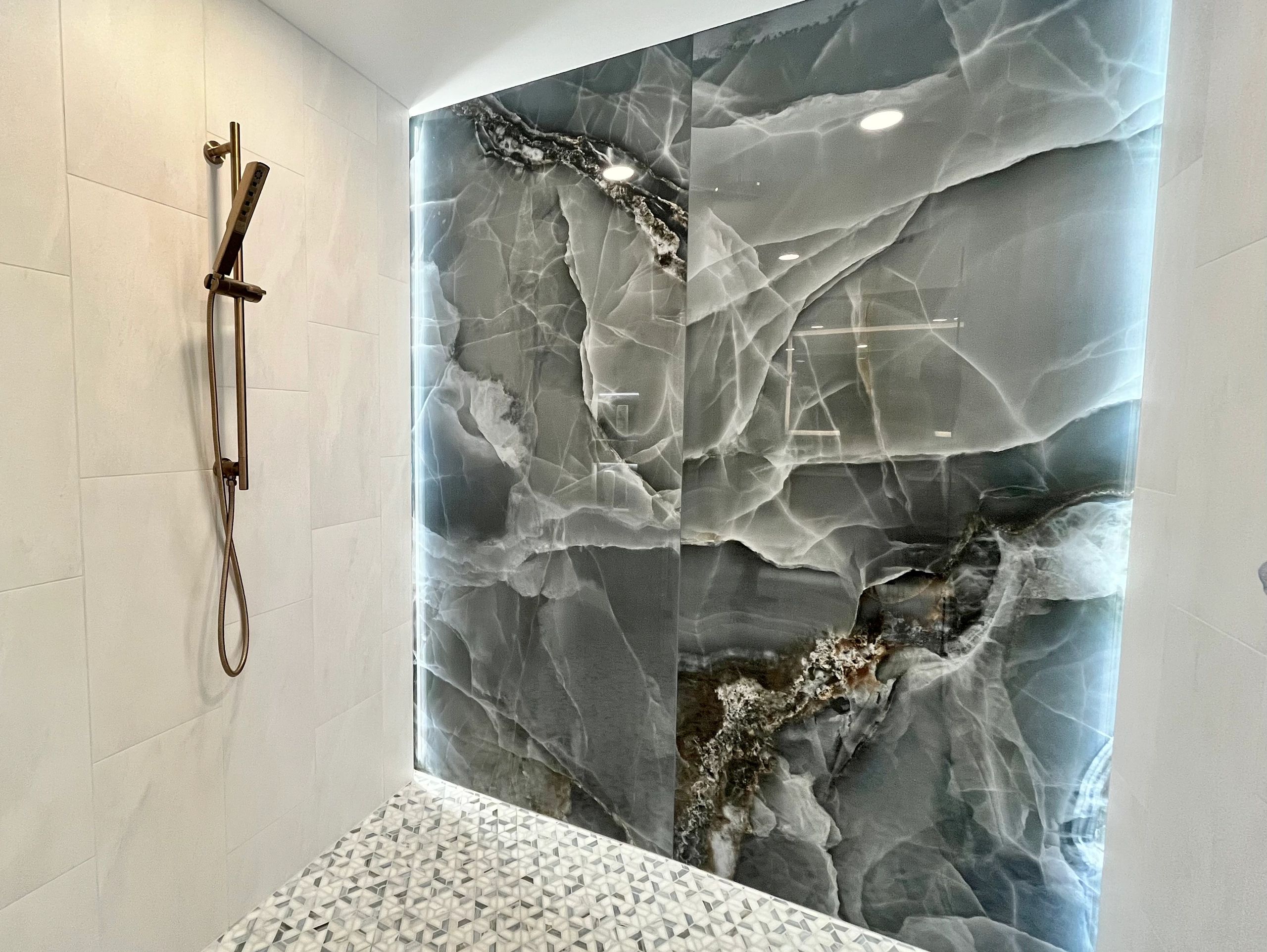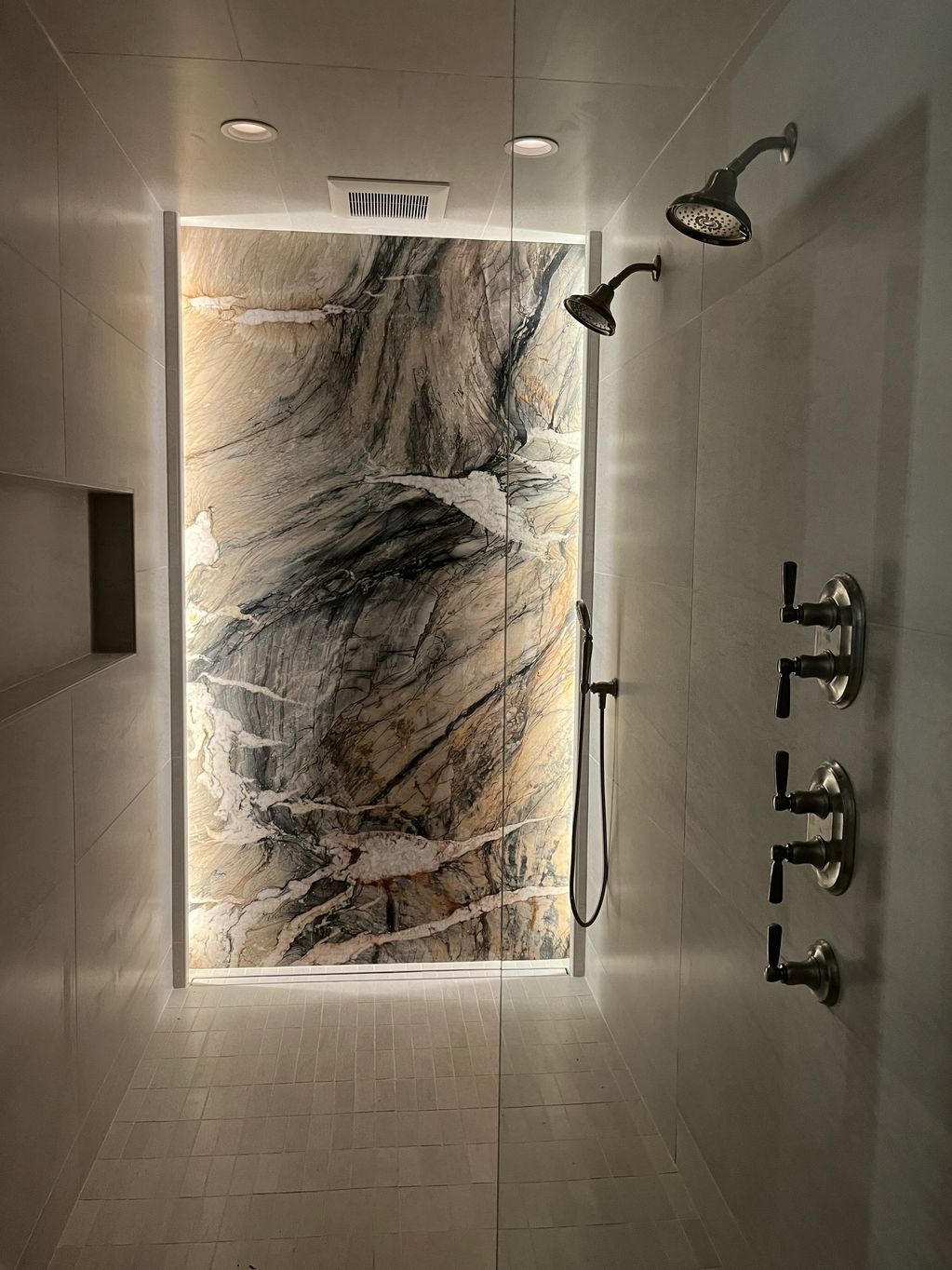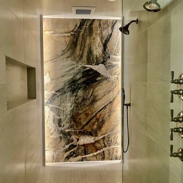 The warmth and movement of this beautiful quartzite slab is the "art" feature in the updated primary shower. It adds a contemporary feel while complimenting the adobe style of the home.