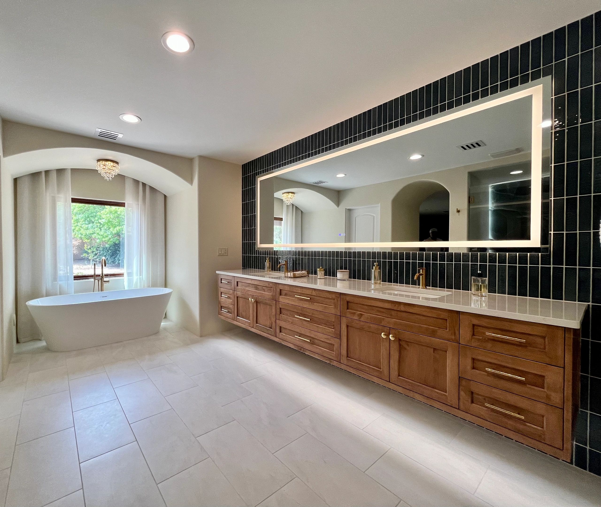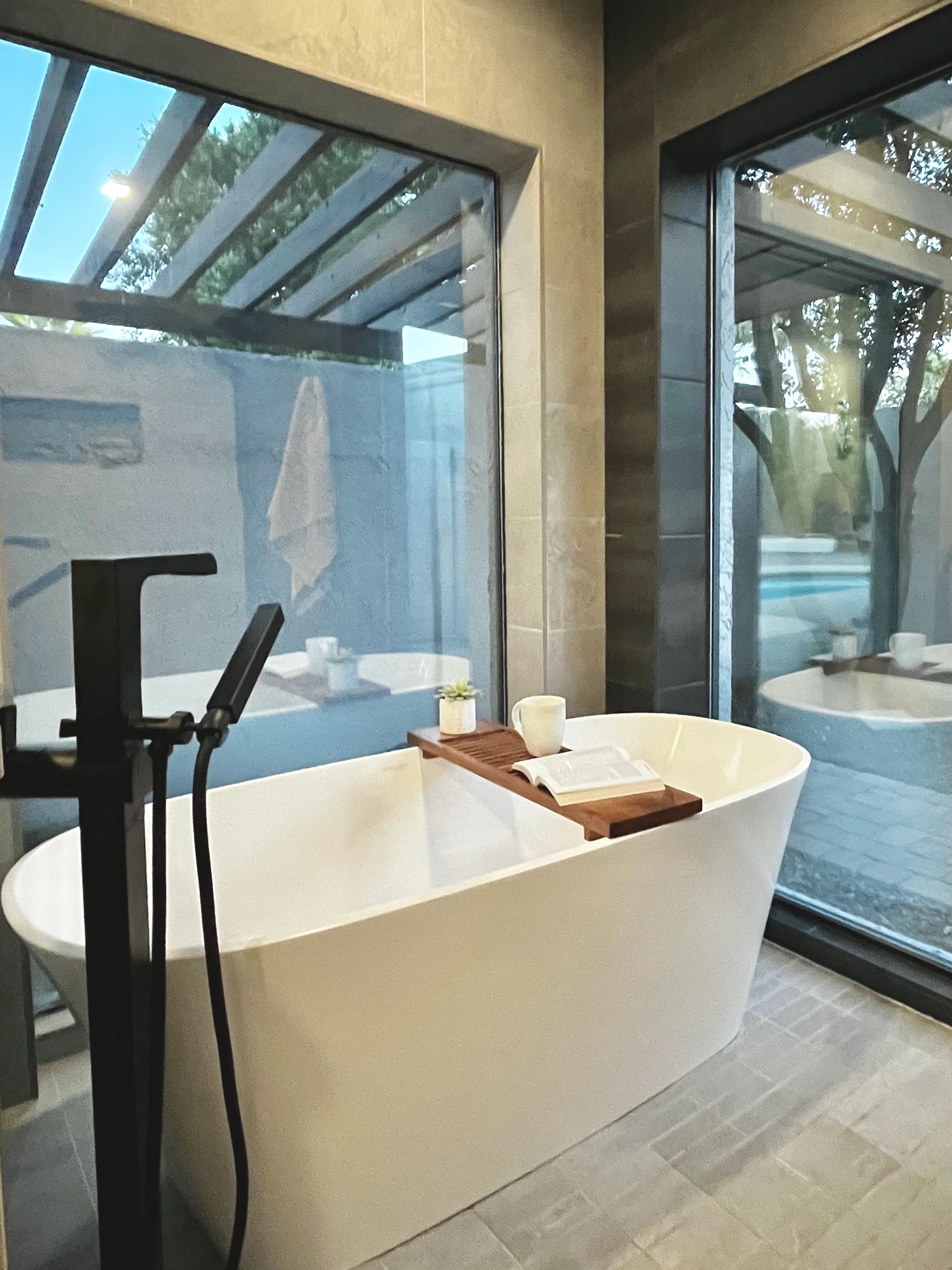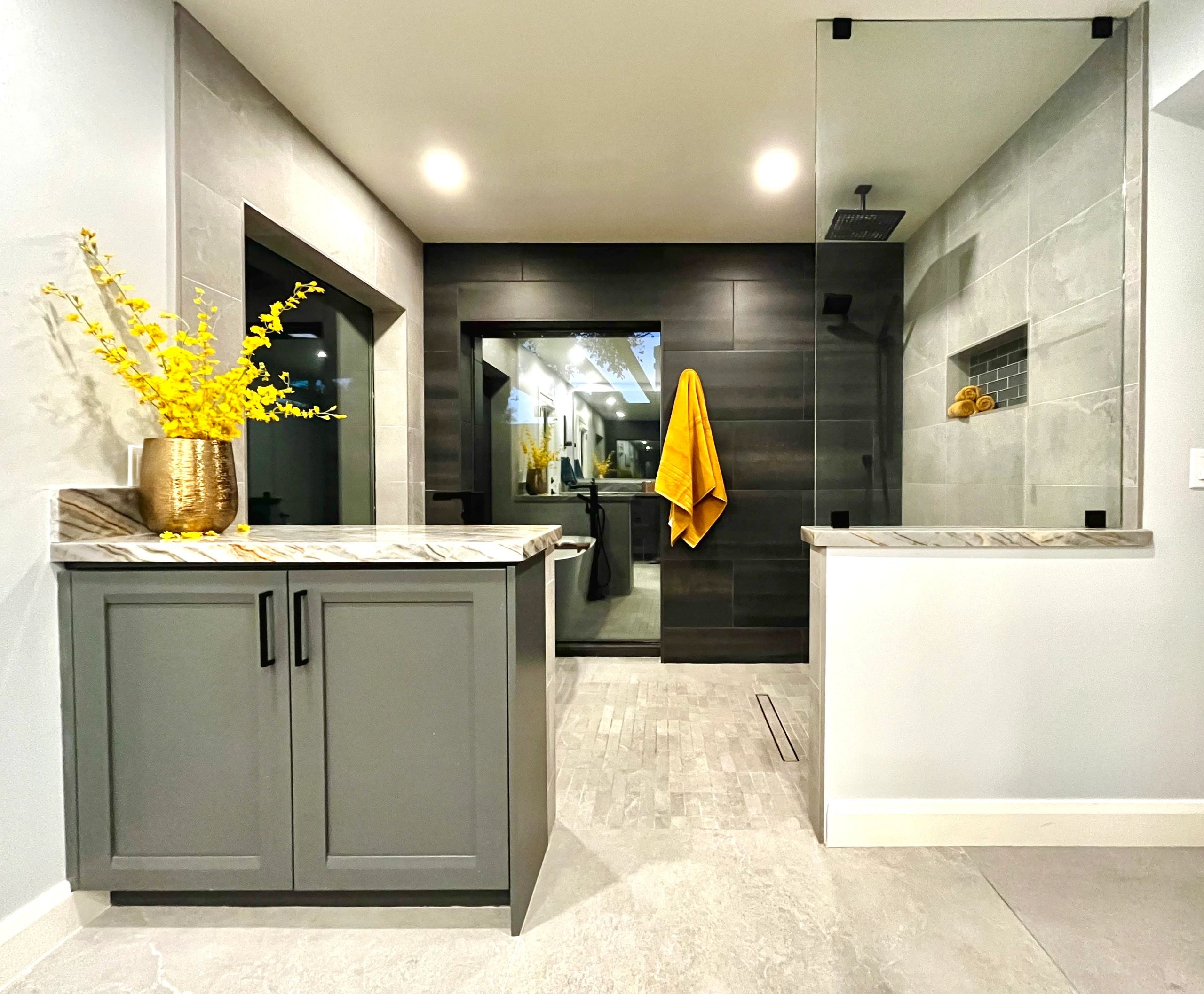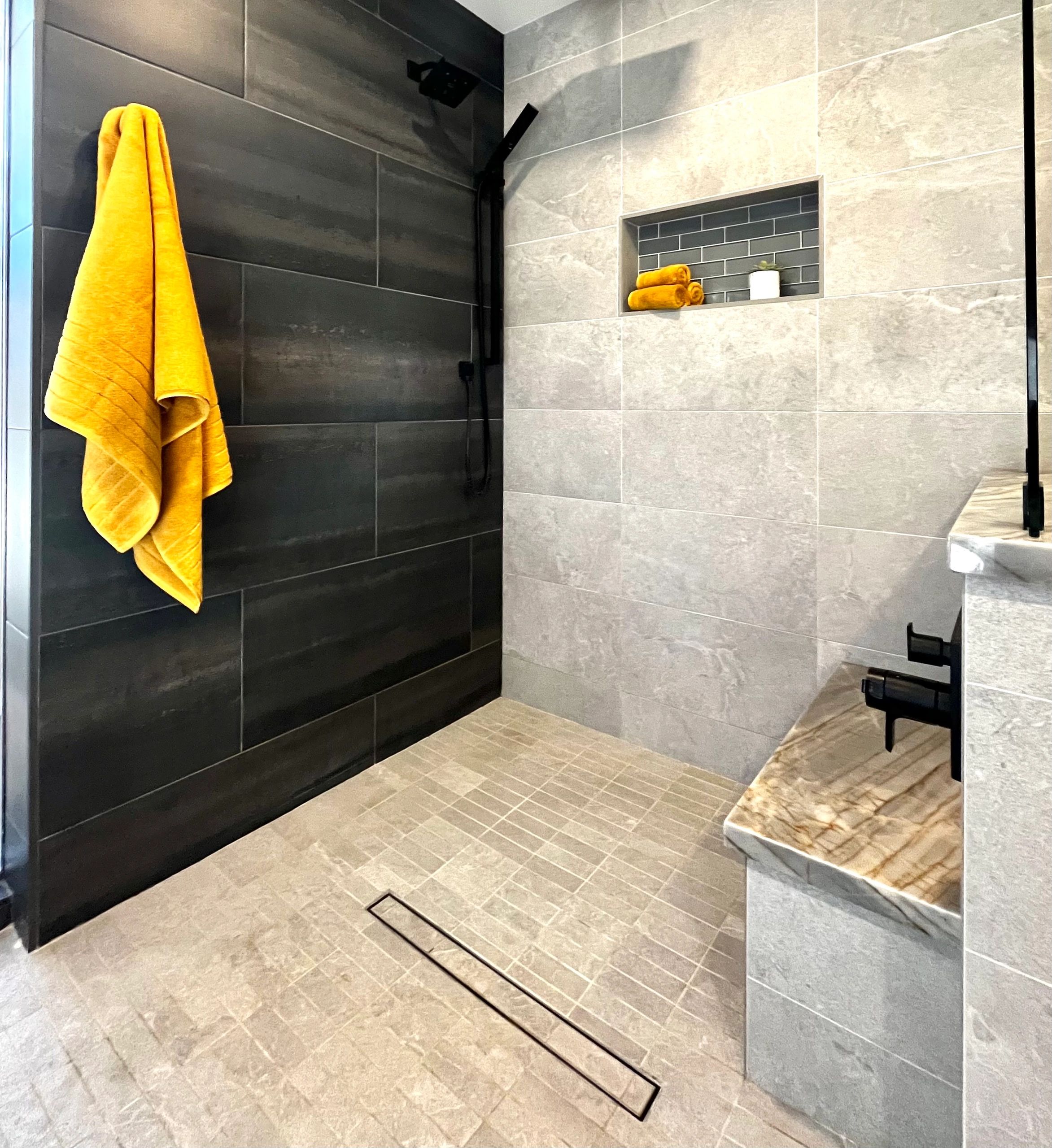The warmth and movement of this beautiful quartzite slab is the "art" feature in the updated primary shower. It adds a contemporary feel while complimenting the adobe style of the home.