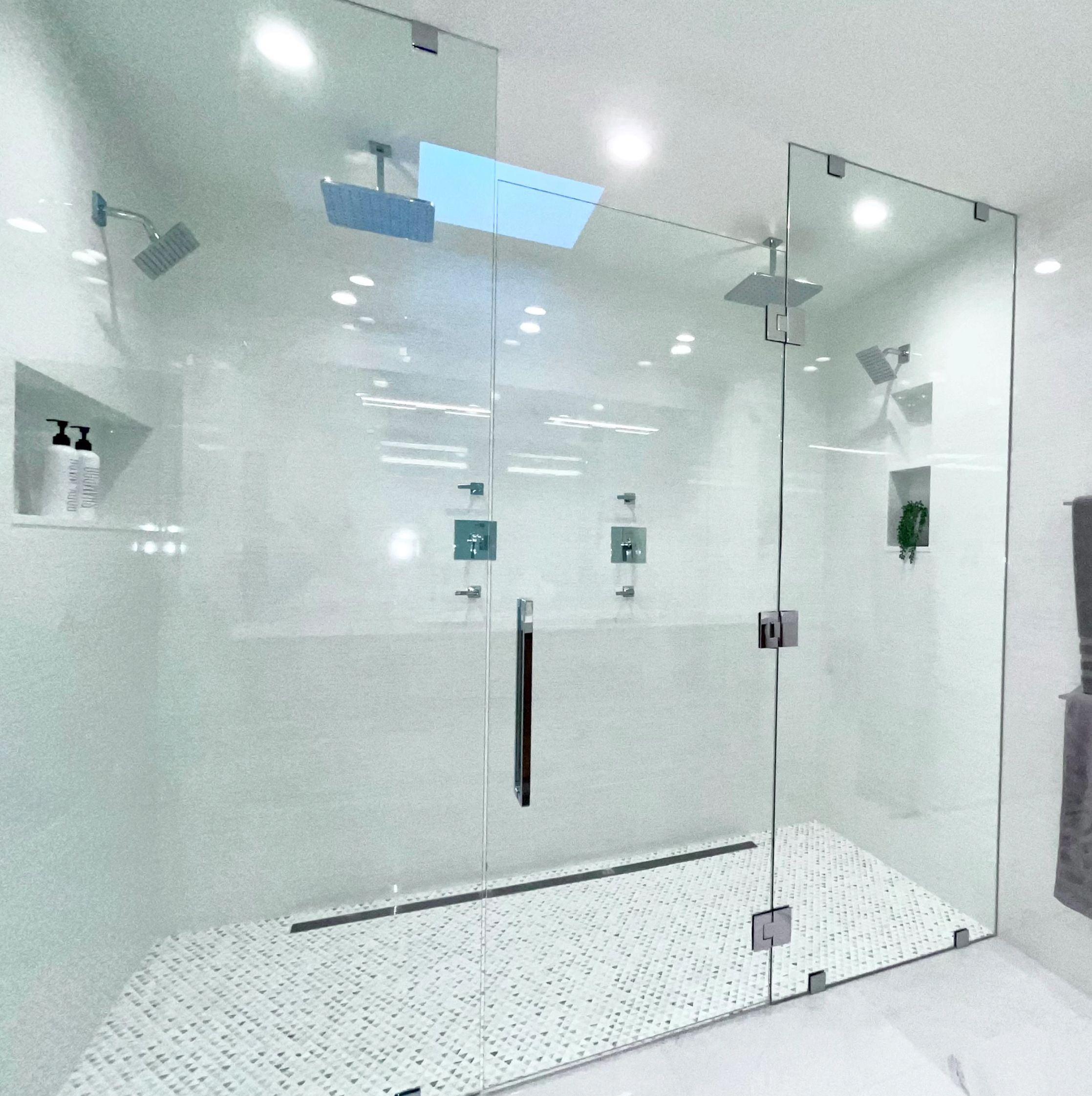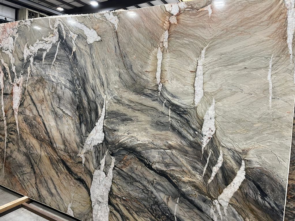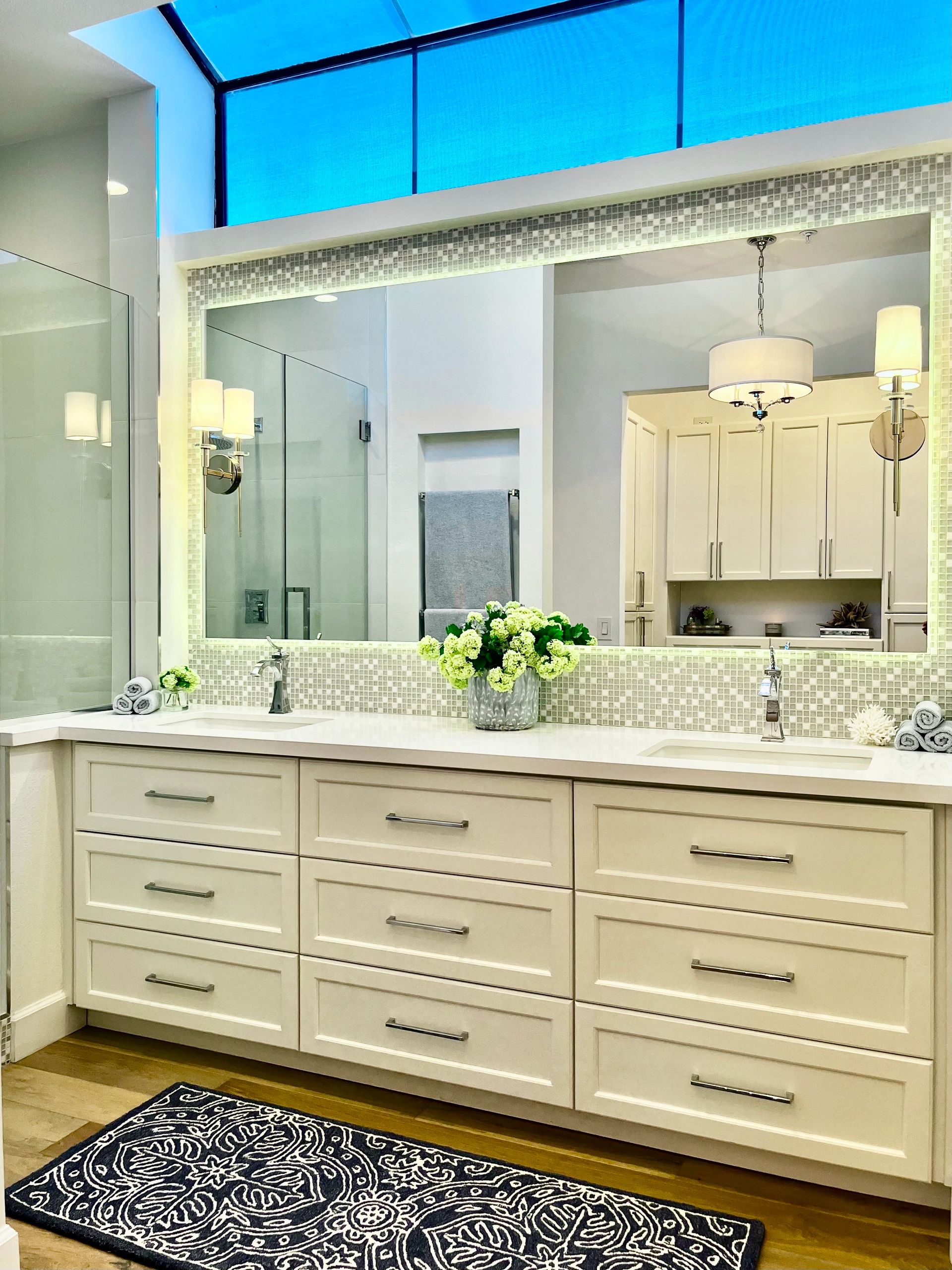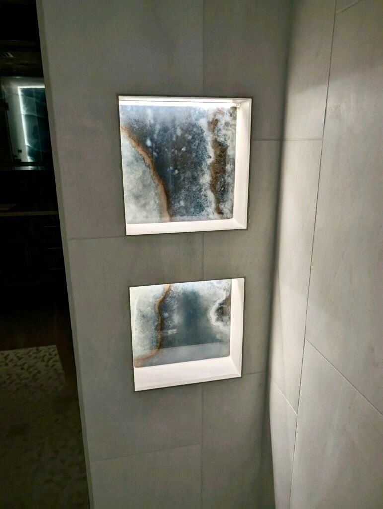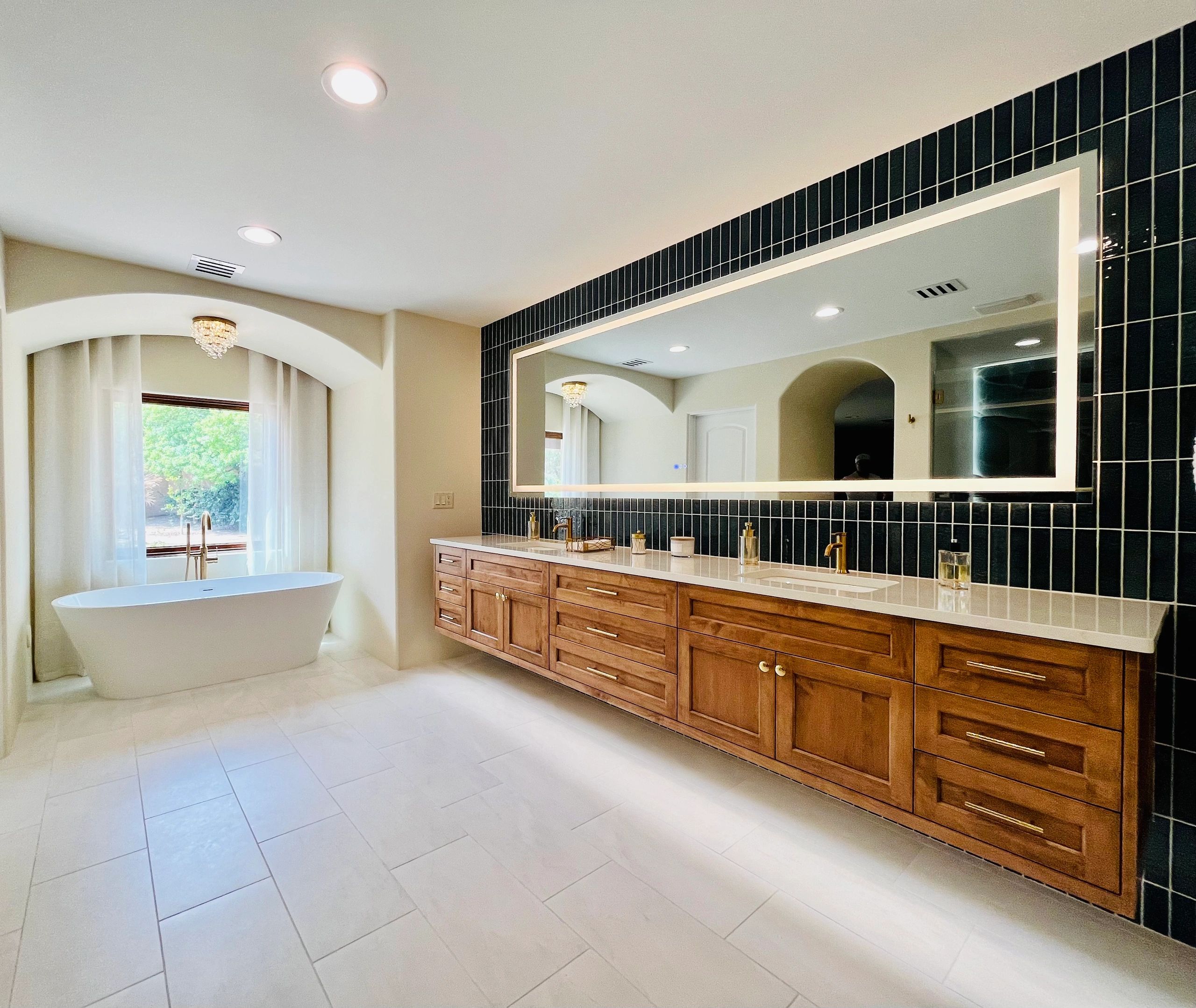 The warmth and movement of this beautiful quartzite slab is the "art" feature in the updated primary shower. It adds a contemporary feel while complimenting the adobe style of the home.
